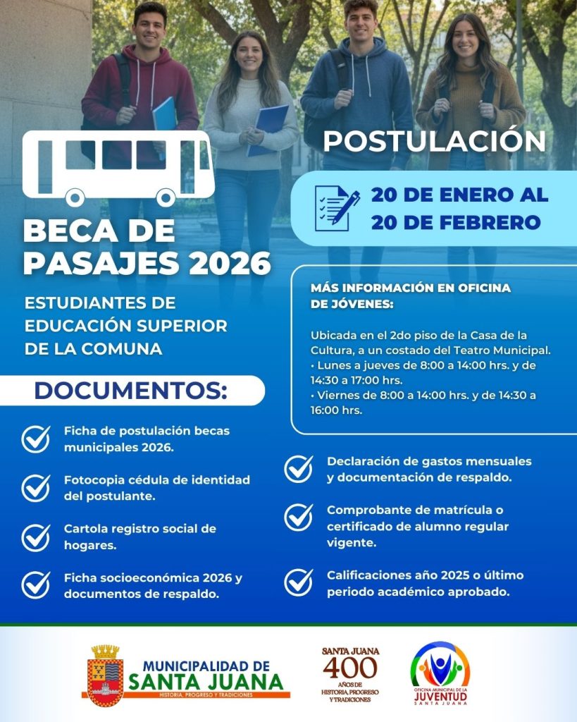 Si eres de nuestra comuna y estás cursando estudios de Educación Superior, ¡esta información es para ti! Ya se acerca el proceso de postulación a la BECA DE PASAJES 2026, un beneficio exclusivo pensado para apoyar el traslado de nuestros jóvenes santajuaninos.